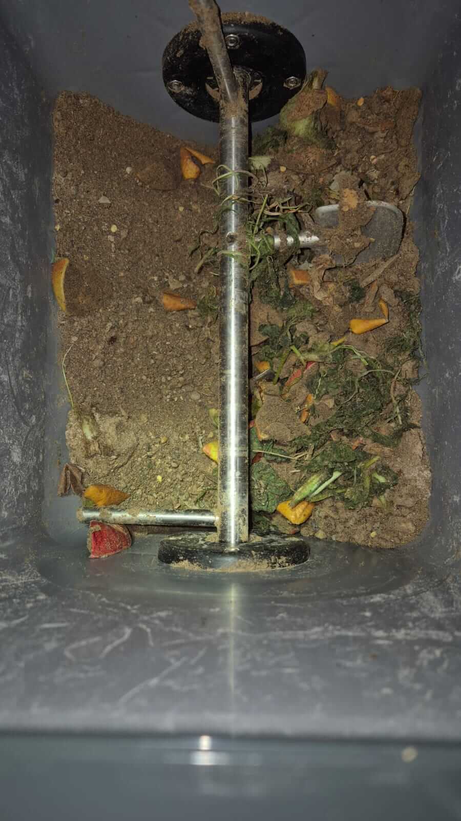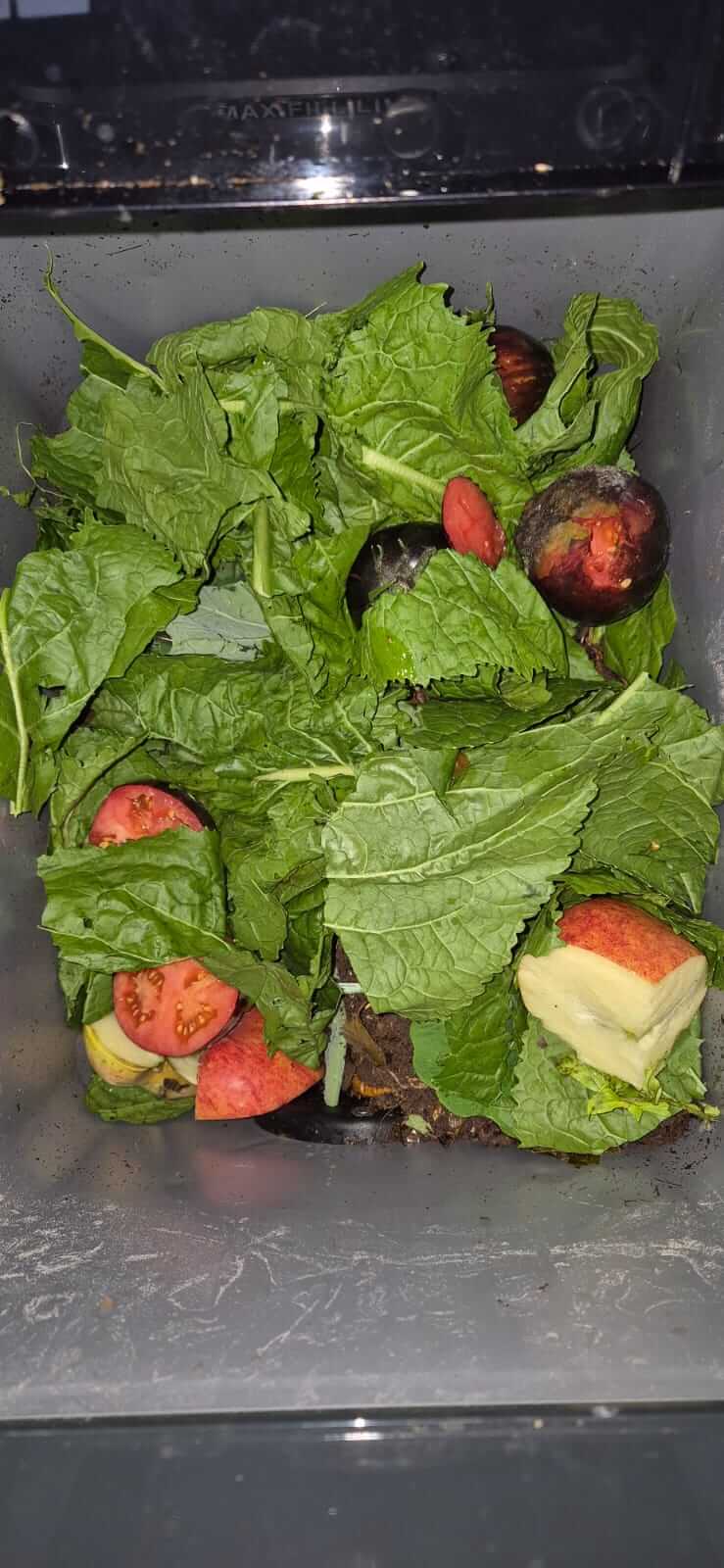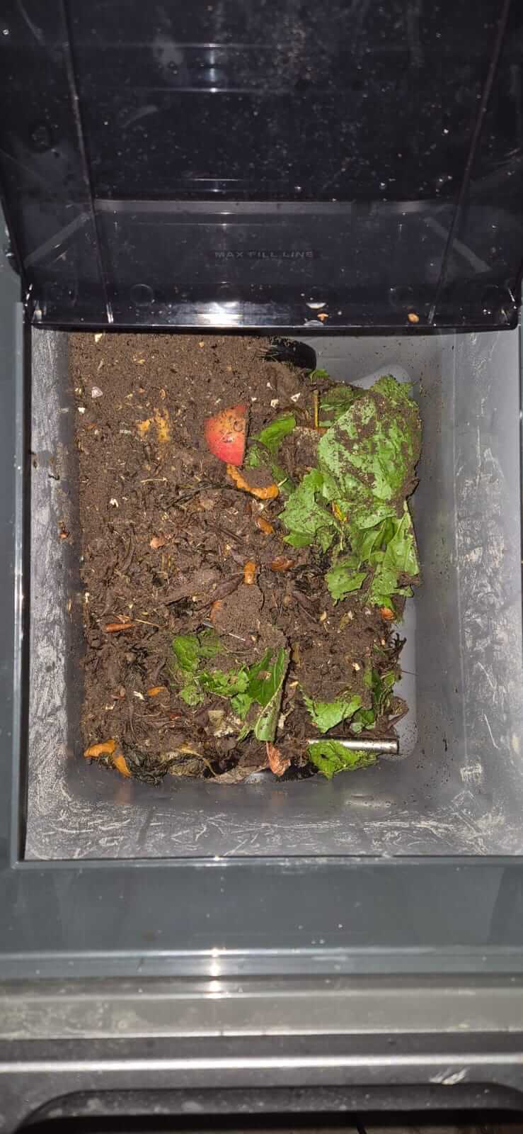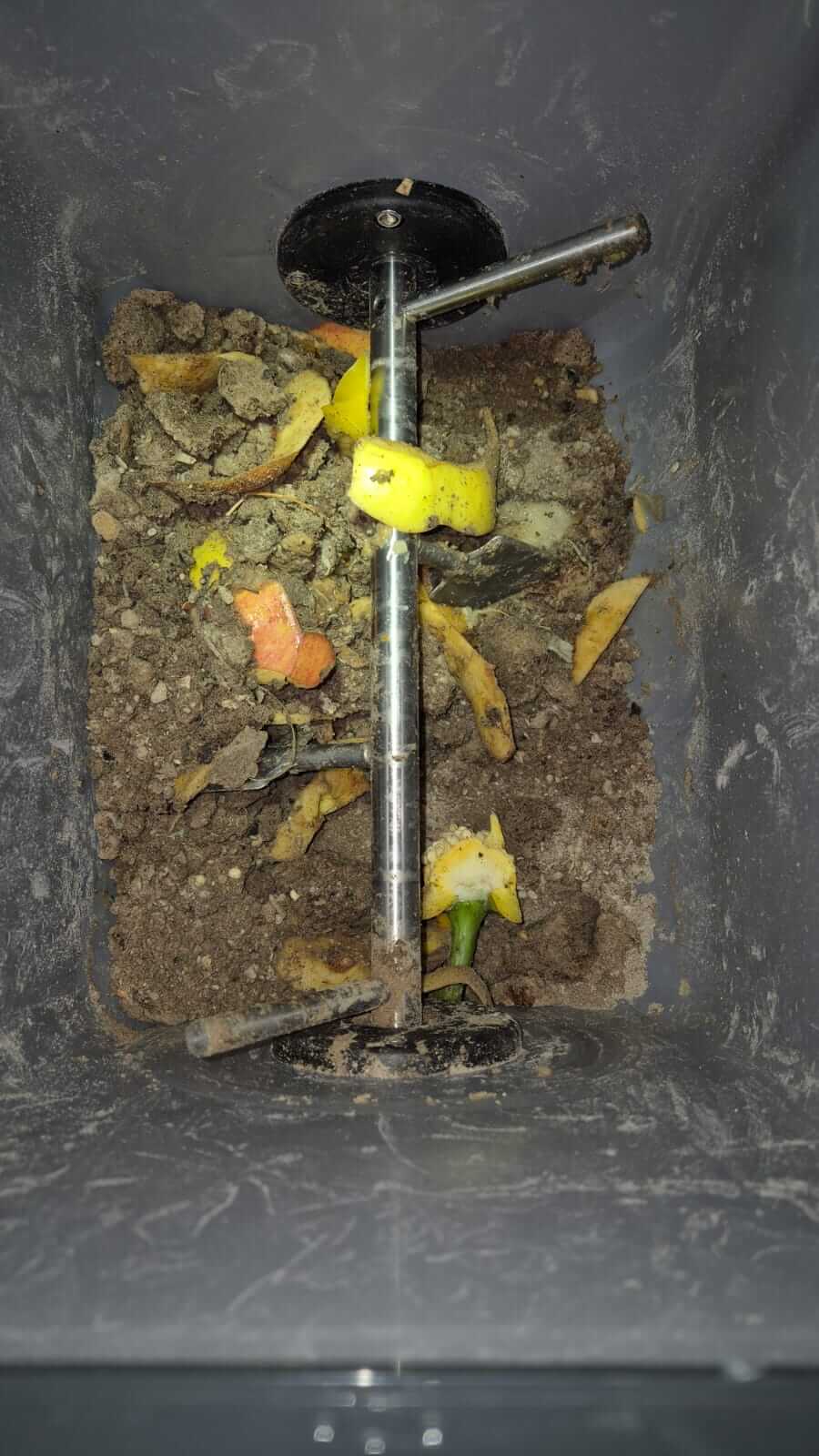 Rekening houdend met wat er in mag, voorzichtig aan beginnen met dagelijks te vullen. Elke keer weer verbazend om te zien hoe de composter vol lijkt te raken en de volgende dag weer ruimte is om bij te vullen. De 80% reductie is dan heel goed zichtbaar. Na 3 weken dagelijks bijvullen is de maximum vulhoogte nog steeds niet bereikt. Wel is duidelijk zichtbaar en voelbaar dat er al een mooie droge compost ontstaat.